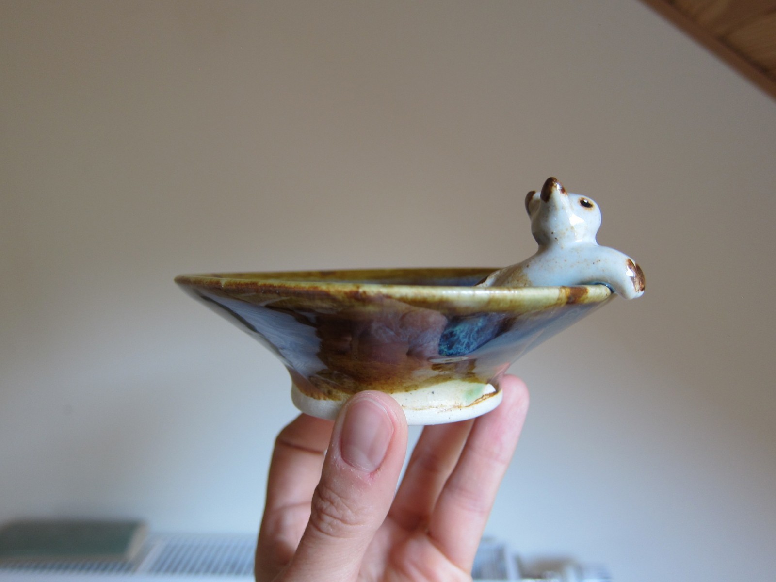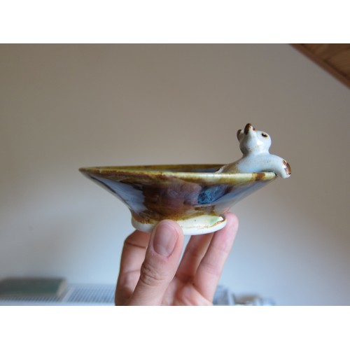 La coupelle est émaillée en bleu-vert et marron, le chat en blanc crème. Le dessous du pied n'est pas émaillé.